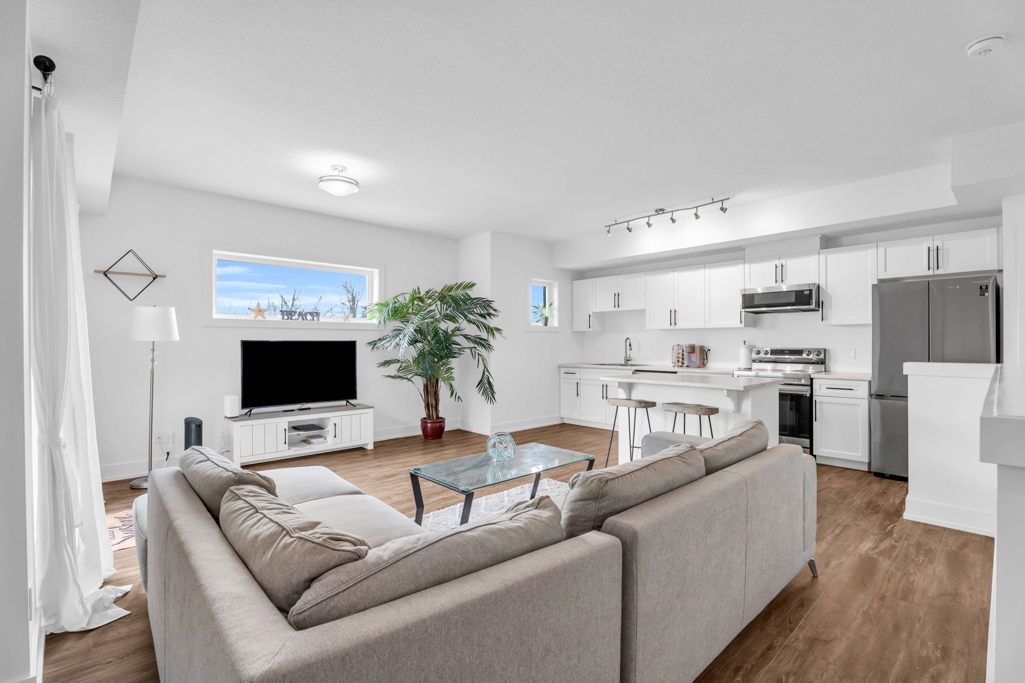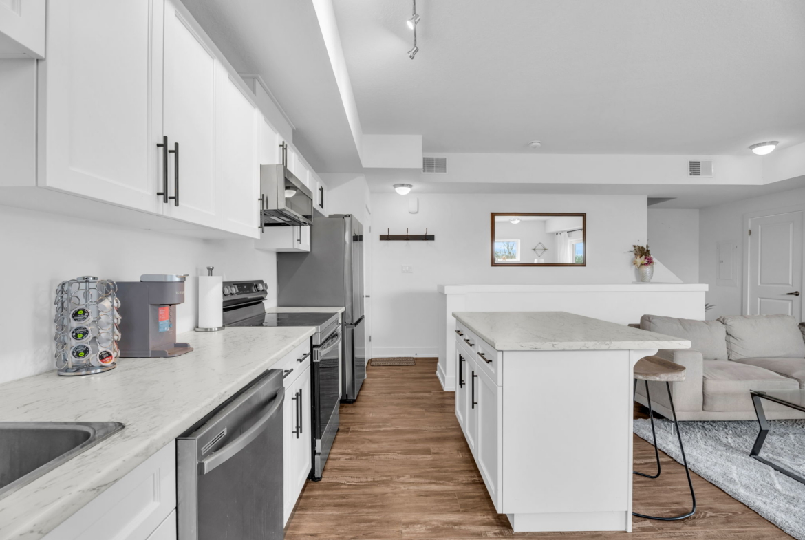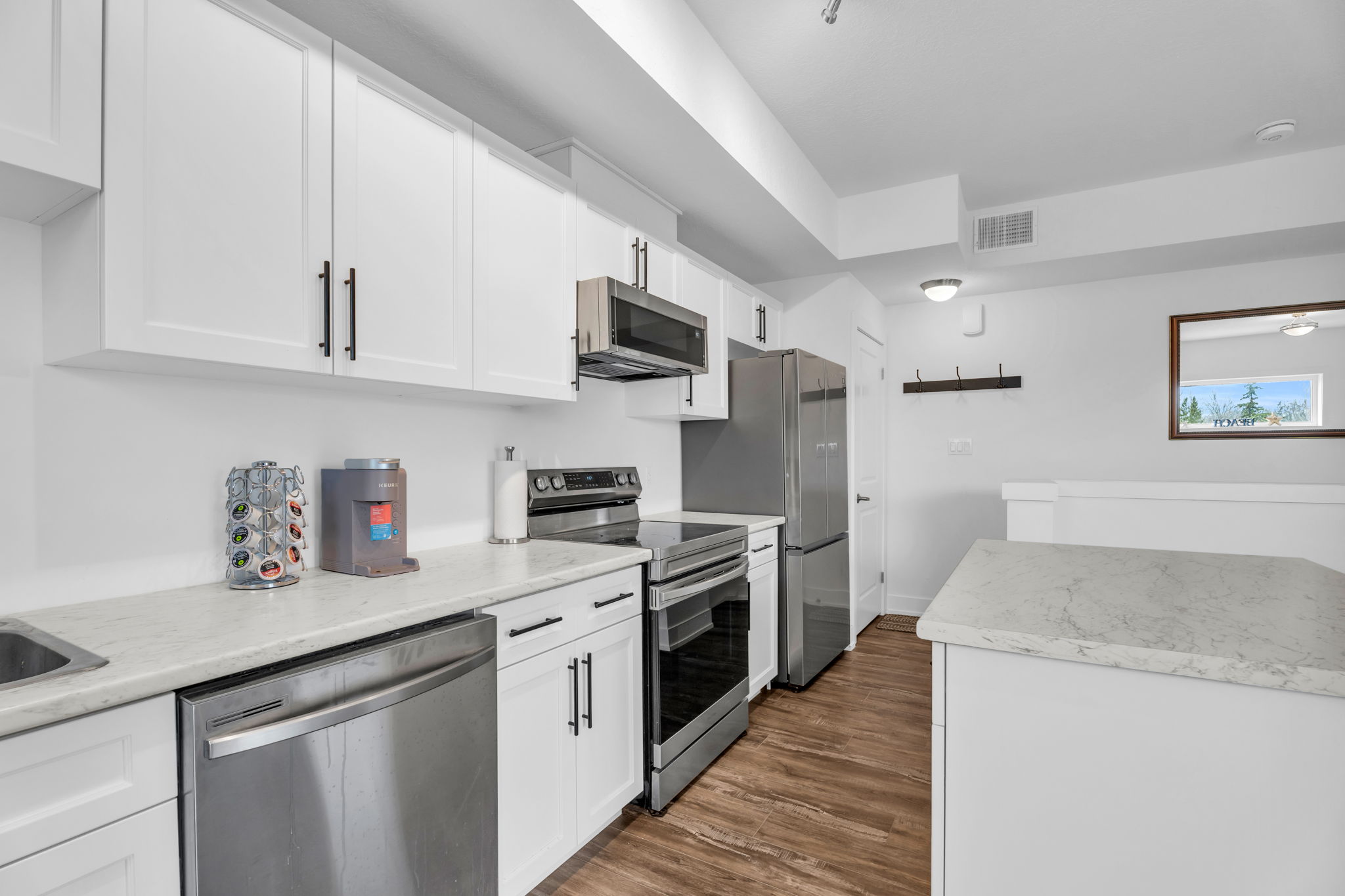 Inside, the modern kitchen is ready for whatever the day brings whether it’s a quick breakfast at the island or prepping something more elaborate with your stainless steel appliances. The flow between the kitchen and living space makes everything feel connected, easy and comfortable.