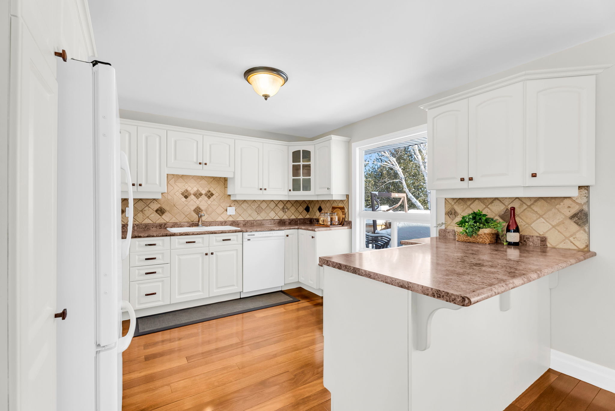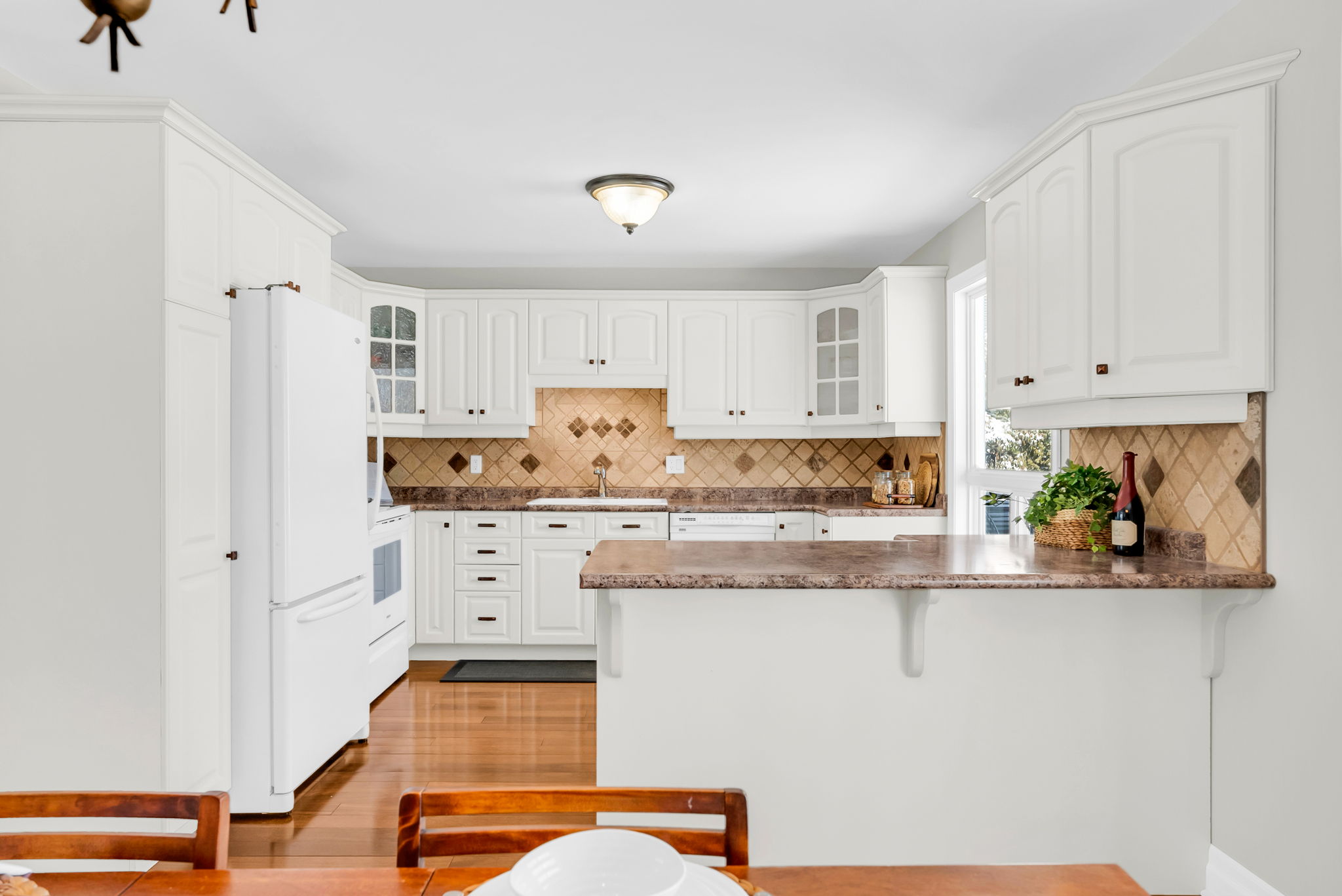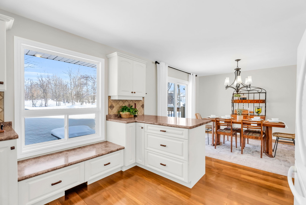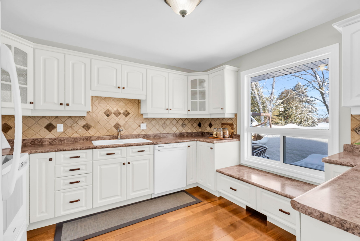 Inside, the main floor features hardwood flooring throughout with no carpet anywhere in the home. The spacious kitchen is both functional and inviting, offering a breakfast bar, built-in window seating, classic cabinetry, ample storage, and a layout that has been exceptionally well cared for. California shutters add a timeless finish throughout.