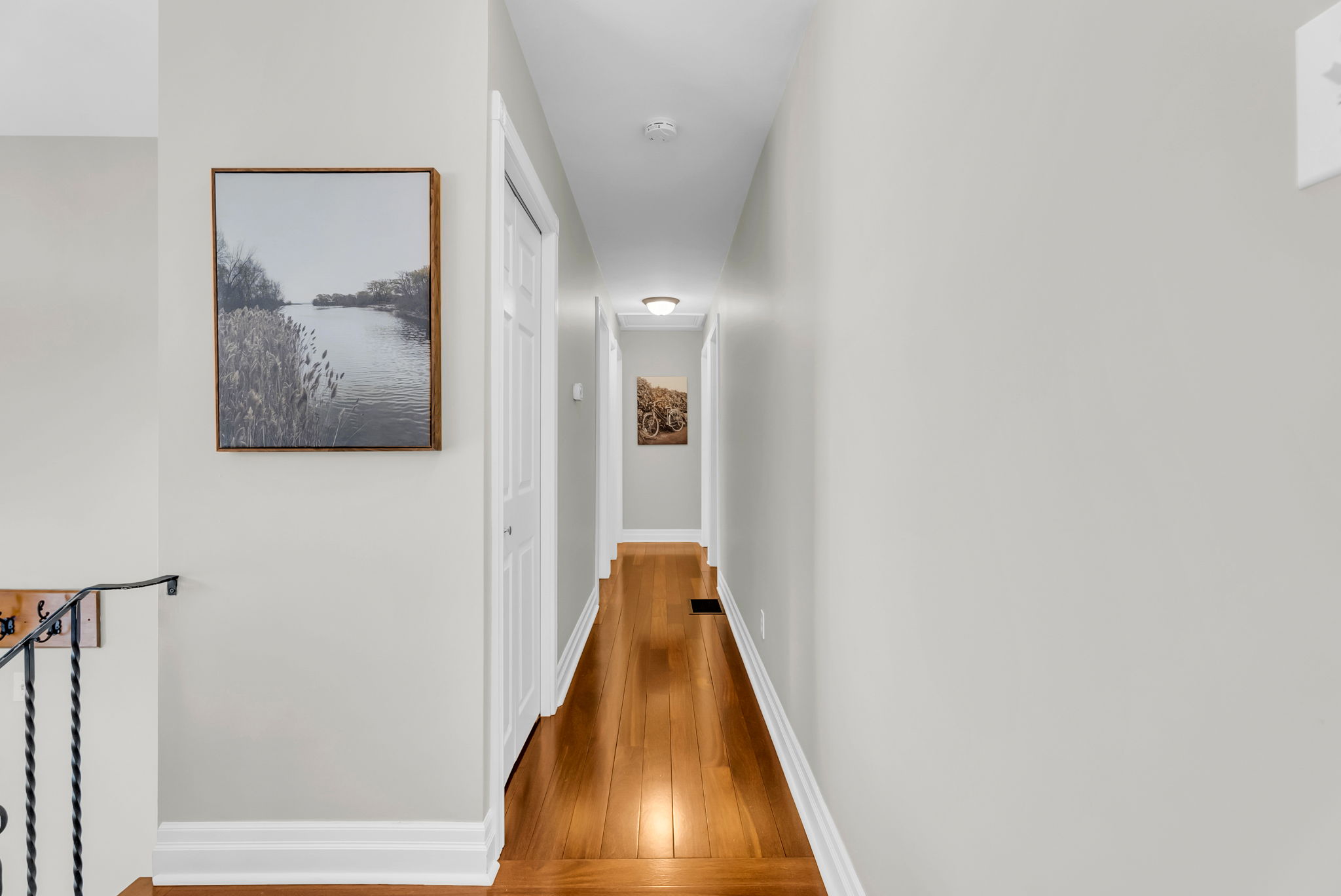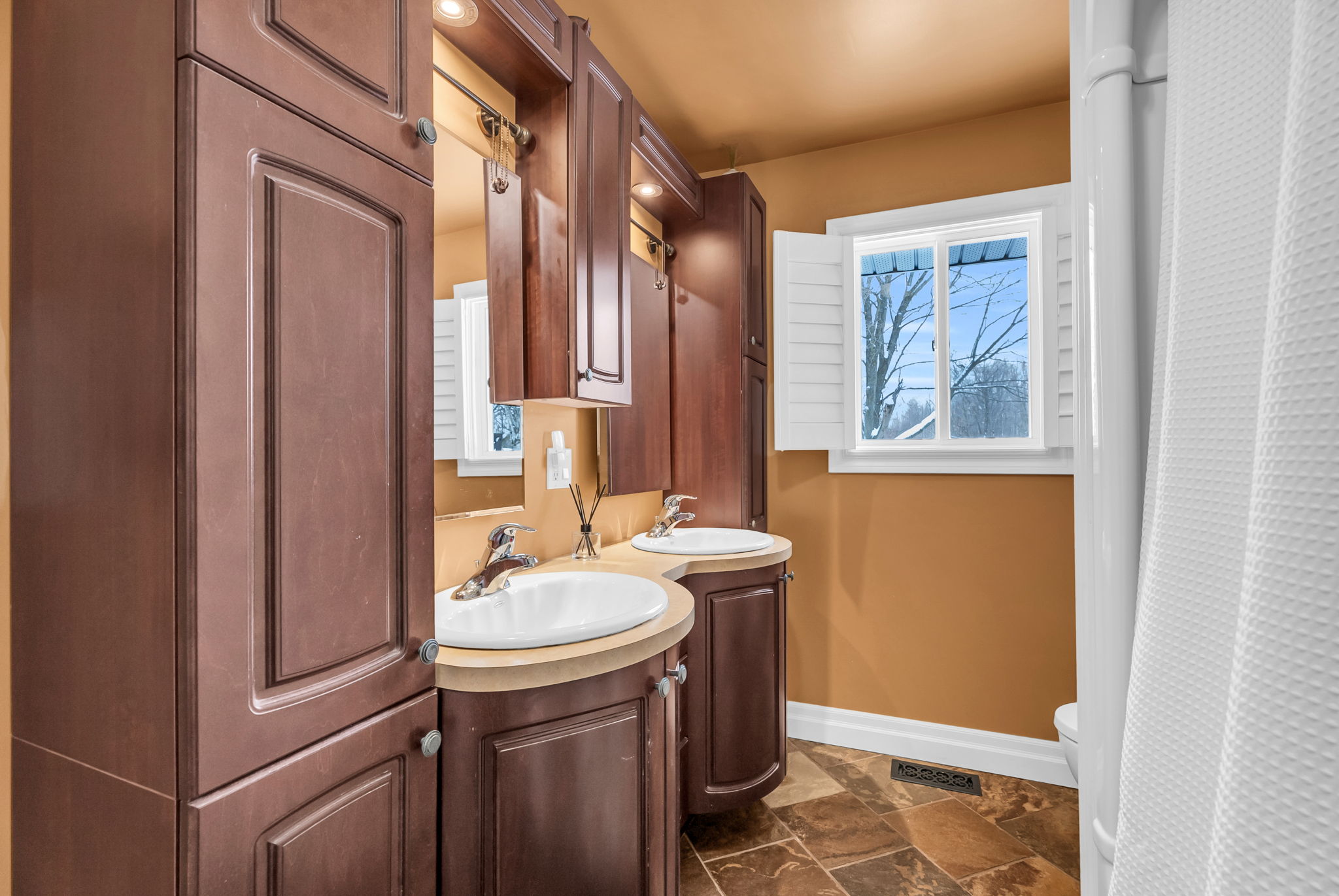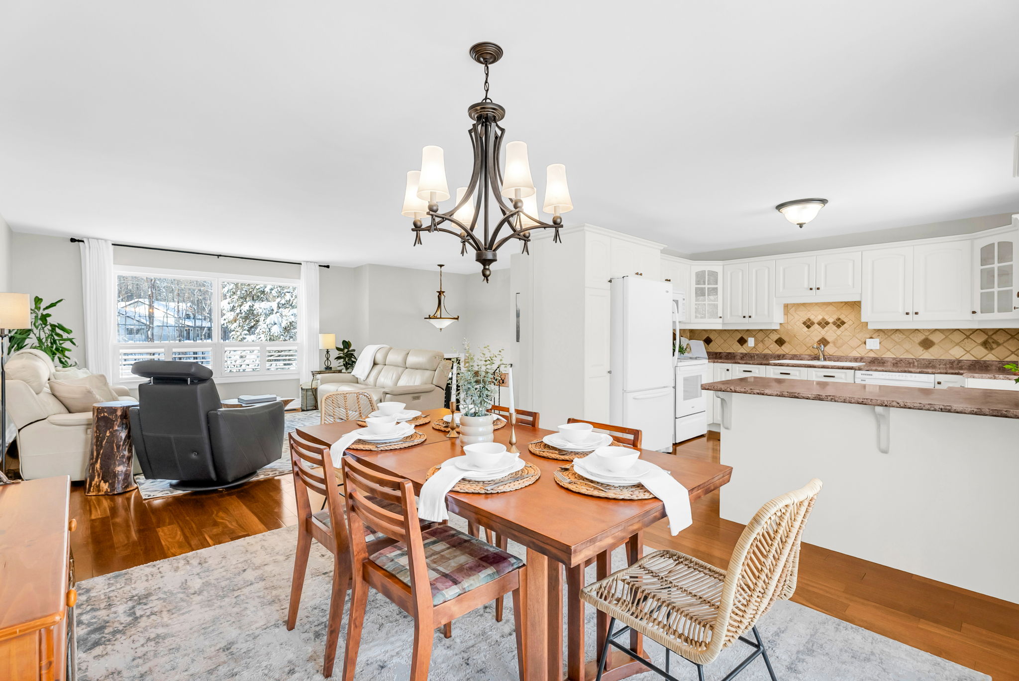 Inside, the main floor features hardwood flooring throughout with no carpet anywhere in the home. The spacious kitchen is both functional and inviting, offering a breakfast bar, built-in window seating, classic cabinetry, ample storage, and a layout that has been exceptionally well cared for. California shutters add a timeless finish throughout.
